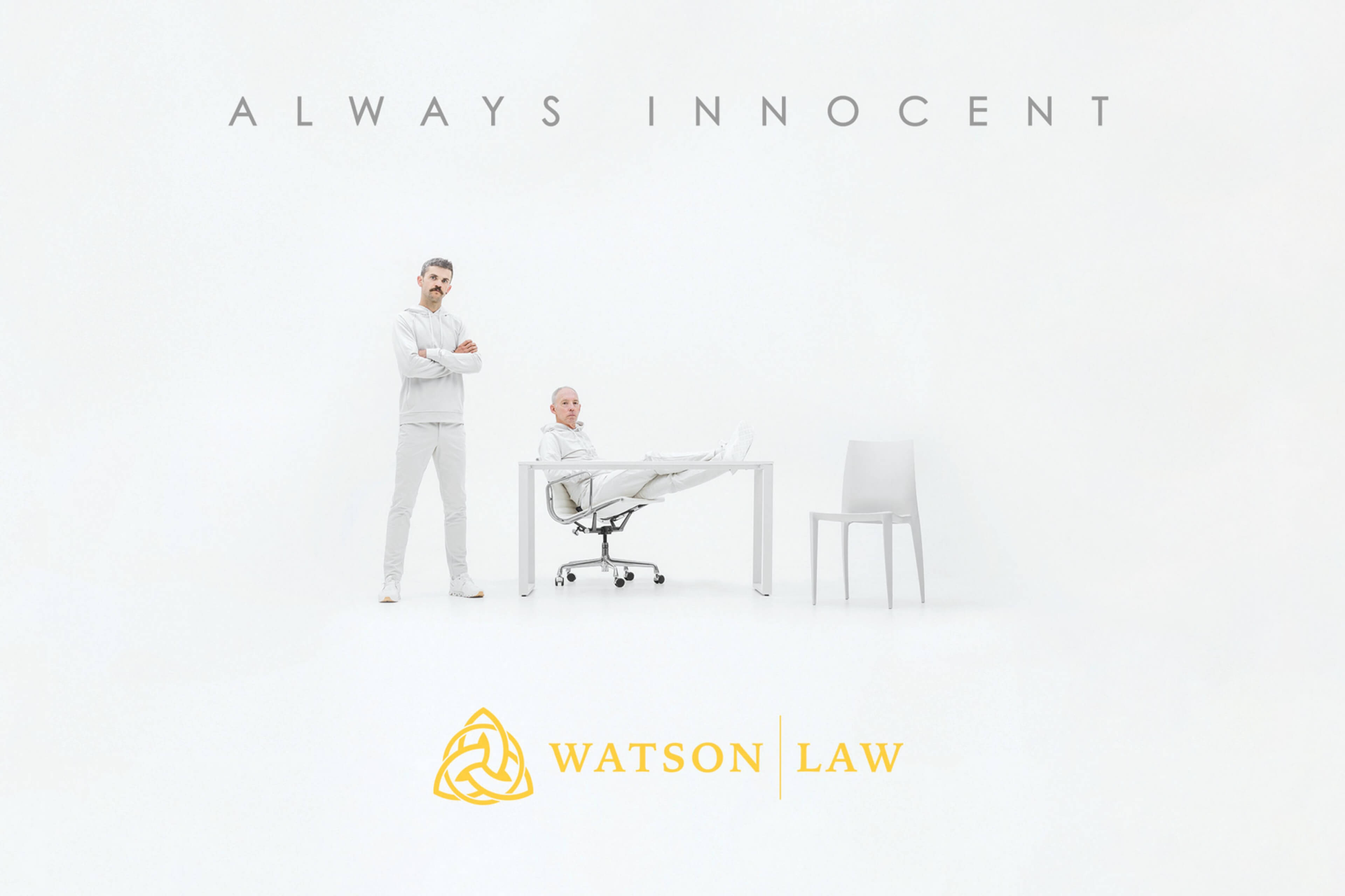 Every component of Watson Law's integrated advertising offers the same clear, symbolism-imbued messaging of innocence until proven otherwise. The primary website landing page photo features the father-son duo clad all in white in a bare white room — clear of everything from accusations to evidence — save a table and a single unoccupied white chair, an invitation to sit down and share the unmitigated truth. The campaign is heavily positioned in both digital and print media channels aimed at capturing the law office's core demographic: college students, youth, young professionals, and first-time offenders.